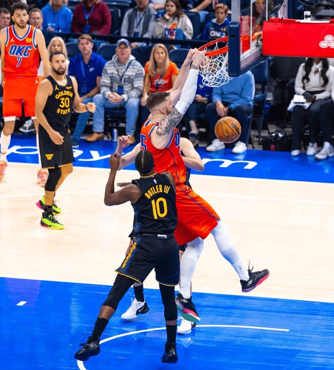 易边再战,库里外线补防上迎,第三节初被吹个人本场第四次犯规,这个没看懂?哈滕高位策应送击地妙传,米切尔上篮轻松得手,科尔脸色铁青无奈叫停。库里上线挤过挡拆跟防再次被吹第五犯,科尔依旧选择不换下。亚历山大攻守转换加速突破,顶开格林后小拉杆上篮打进2+1,随后弧顶大空位三分再投进,雷霆将分差彻底拉开至30分。