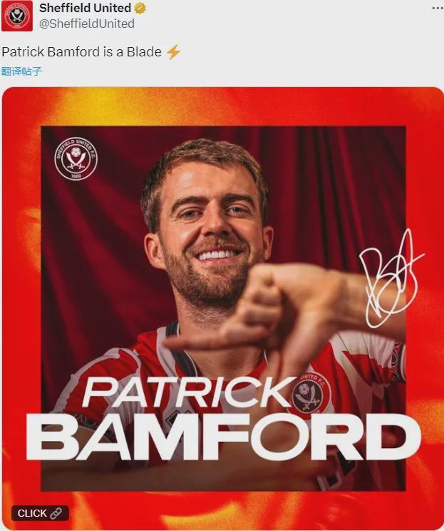 官方:谢菲联宣布免签了帕特里克-巴姆福德,这名前锋签下了一份1月到期的短期合同。